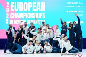 At the conclusion of the 2025 European Championships in Aerobic Gymnastics in Ganja (AZE), Aida Shaliyeva, Project Manager of our global partner SmartScoring, presented the SmartScoring Shooting star award to Hungary’s Zoltán Lőcsei and Ukaine’s Anastasiia Kurashvili.